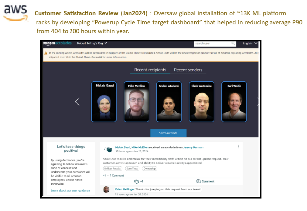 Led the Rack Install Dashboard that reduced P90 install cycle by 50% YoY and supported ~$500M annual savings, improving global visibility for 13K+ ML racks and accelerating EC2 deployment.